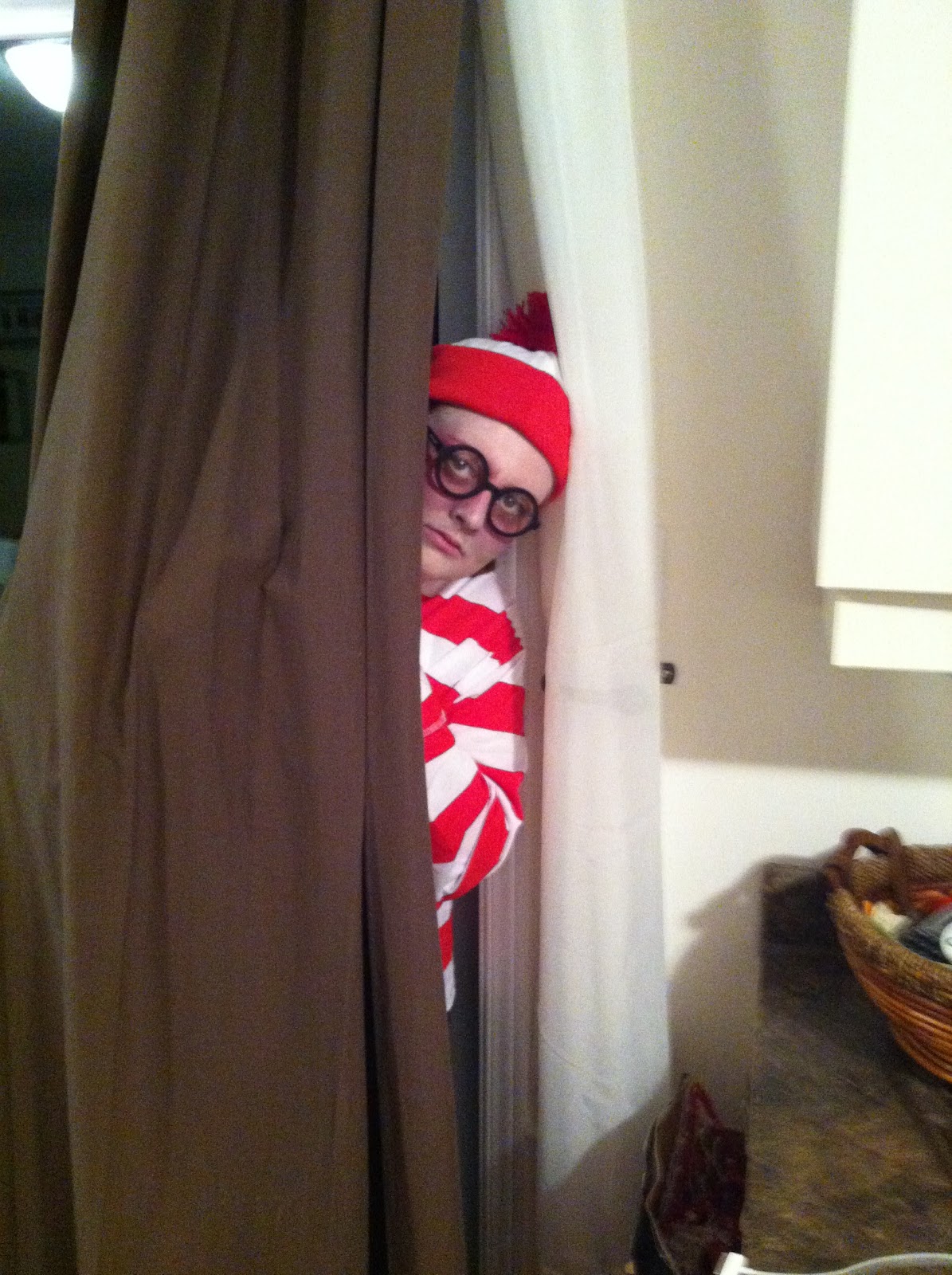 Anyways, last night I went to the party of the year, the Annual Halloween "Zombies or Survivors" bash thrown by two die-hard Halloween enthusiasts Amy and Peter. They went all out, creepy framed pictures on the wall, brain-inspired foods, awesome decoration and pretty cool costumes. The theme was Zombies or Survivors, you had to pick if you were a zombie or a survivor (duh) and the results were pretty awesome. I went as Zombie Where's Waldo. Amazing if I do say so myself. It almost didn't happen though! I kinda dropped the ball this year on Halloween preparation, that and when you are packing for a place like this in the summer, Halloween gear isn't the easiest thing to find at the local Wal Mart. So I ordered from an online party place last week, my costume arrived on Wednesday, just in time!!